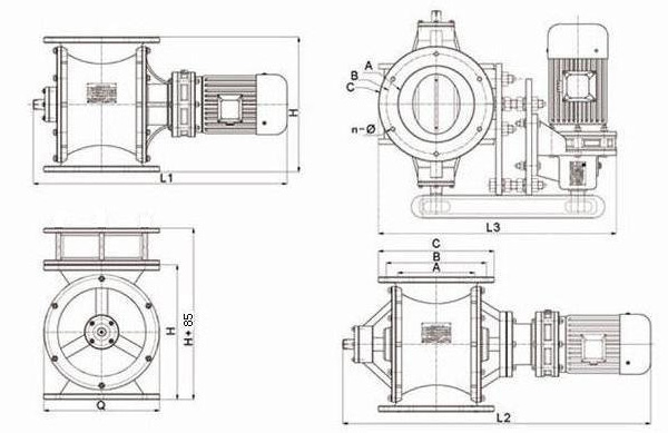 | 型號 | A | B | C | H | Q | L1 (內) | L2 (外) | L3 (鏈) | n-Ф | 工作溫度 ℃ | 轉速 轉/分 | 電機功率KW |
